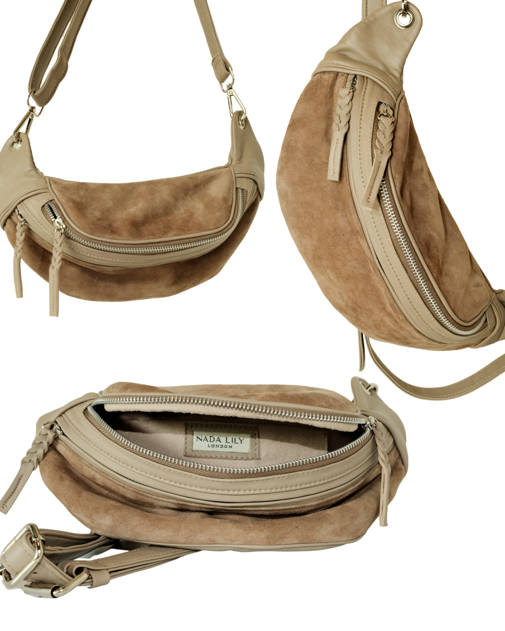 Crafted from supple leather and suede, the Branwen waist/crossbody bag is designed to hold your essentials in effortless style. Embroidered with the signature Nada Lily logo—an understated expression of the sacred Goddess Symbol, Vesica Piscis—it serves as a daily reminder of balance, unity, and inner awakening.