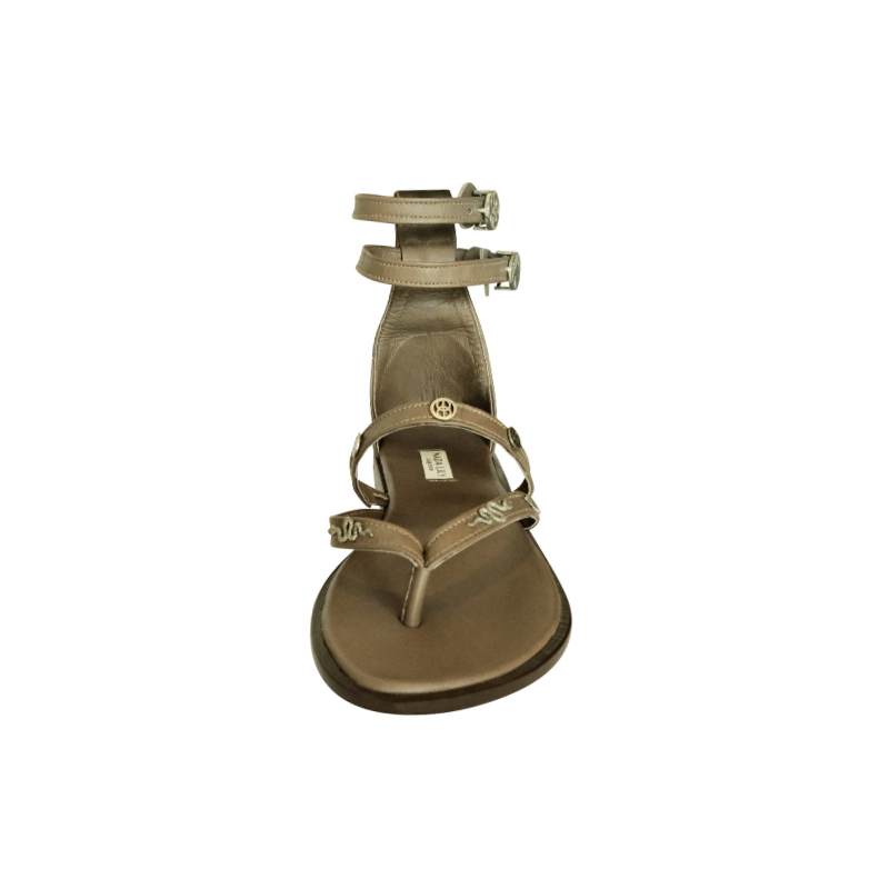 The Frigga thong gladiator with leather upper and sole. Embellished with theA refined gladiator inspired flat, handcrafted with double straps for modern elegance. Embellished with the Kundalini serpent and Vesica Piscis, it channels sacred geometry and divine feminine energy. Designed to awaken the dormant life-force within, it symbolizes balance, creation, and spiritual ascension—where grounded form meets soulful intention snake and signature Goddess symbol to awaken the soul.